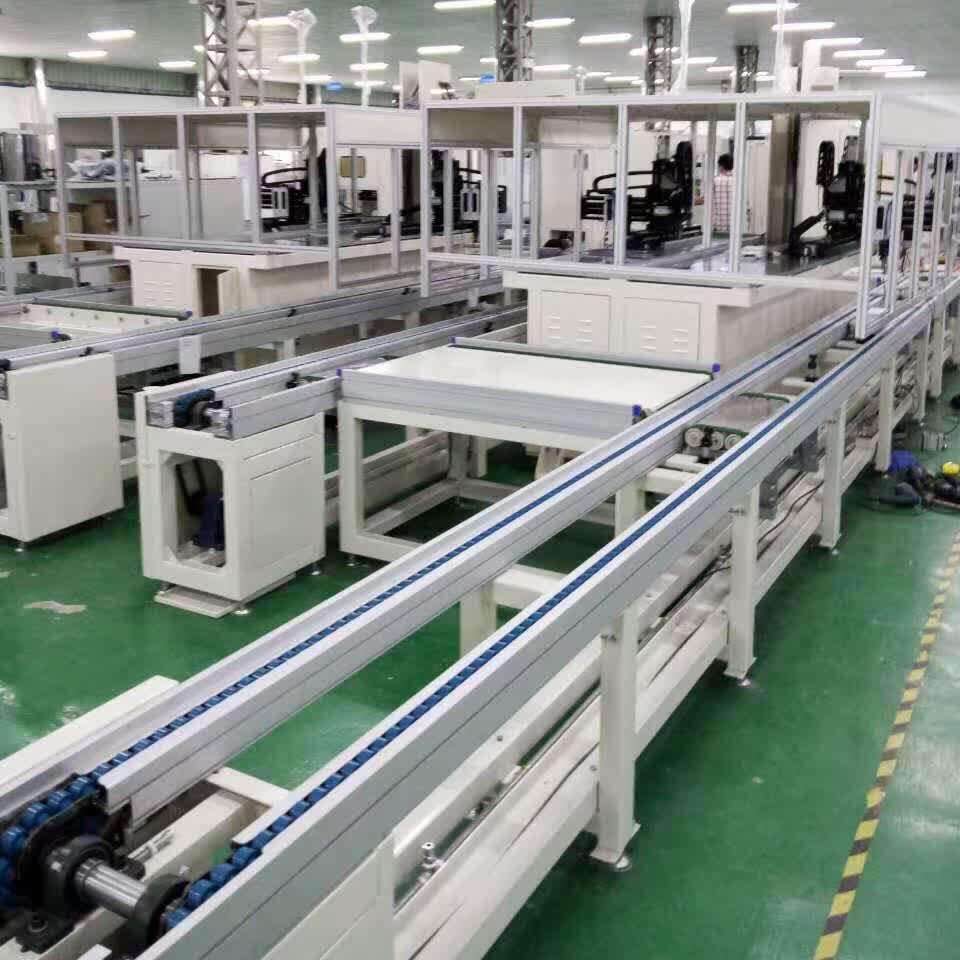 倍速鏈輸送機(jī),其輸送原理是運(yùn)用倍速鏈條的增速功能,使其上承托貨物的工裝板快速運(yùn)行,通過阻擋器停止于相應(yīng)的操作位置;或通過相應(yīng)指令來完成積放動(dòng)作及移行、轉(zhuǎn)位、專線等功能。